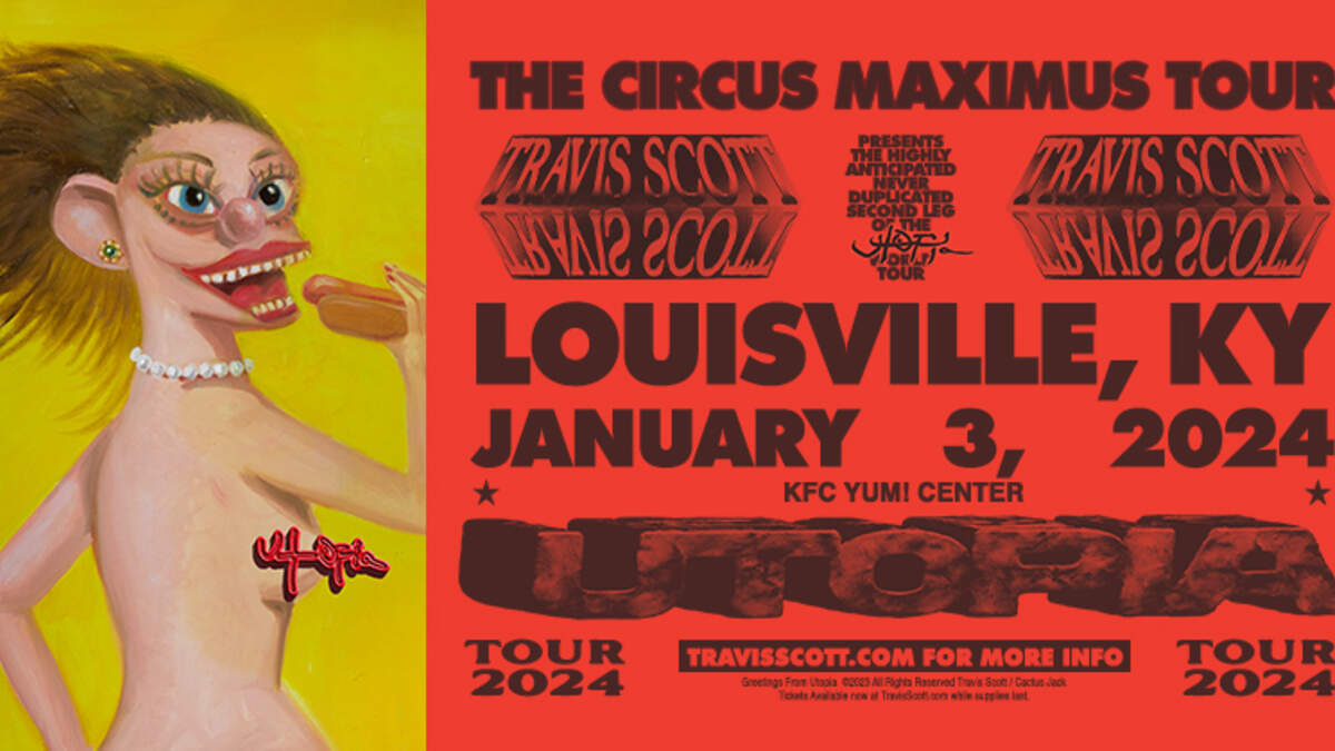Travis Scott Utopia Tour Presents Circus Maximus Wed • Jan 03, 2024 • 8:00 PM KFC Yum! Center, Louisville, KY Buy Tickets: https://www.ticketmaster.com/travis-scott-utopia-tour-presents-circus-louisville-kentucky-01-03-2024/event/16005F69DA0E4778