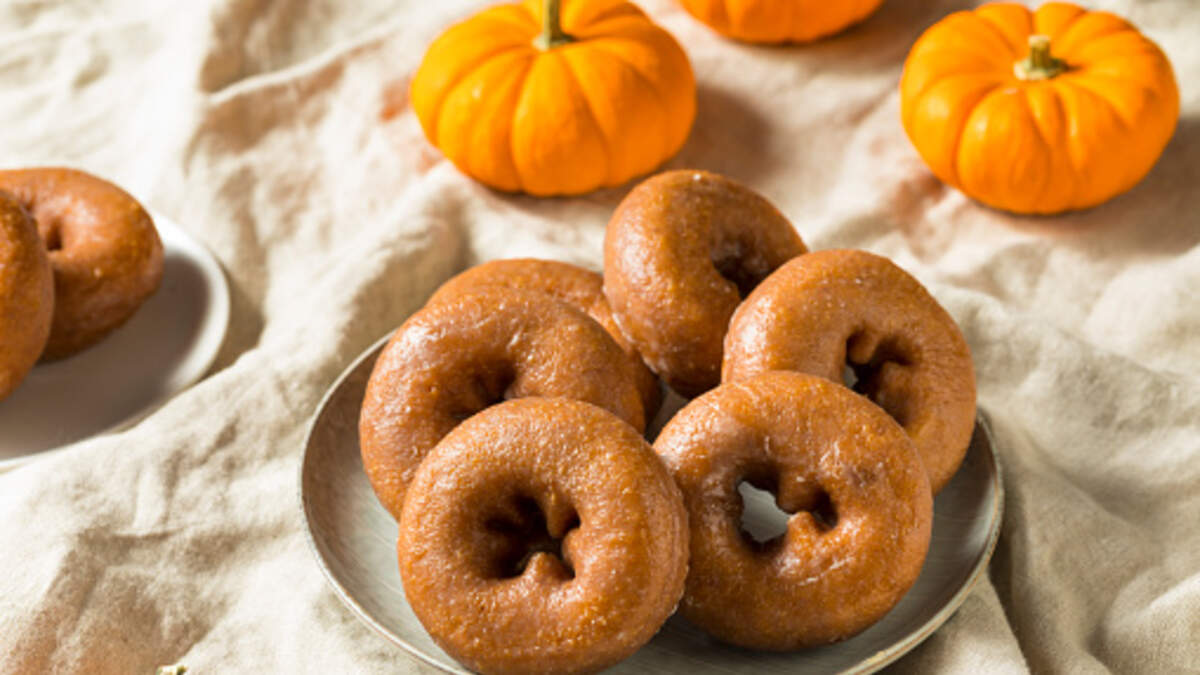 The collection includes a pumpkin spike latte swirl doughnut, a pumpkin spice filled cheesecake doughnut, a pumpkin spice cake doughnut and a pumpkin spice original glazed doughnut.